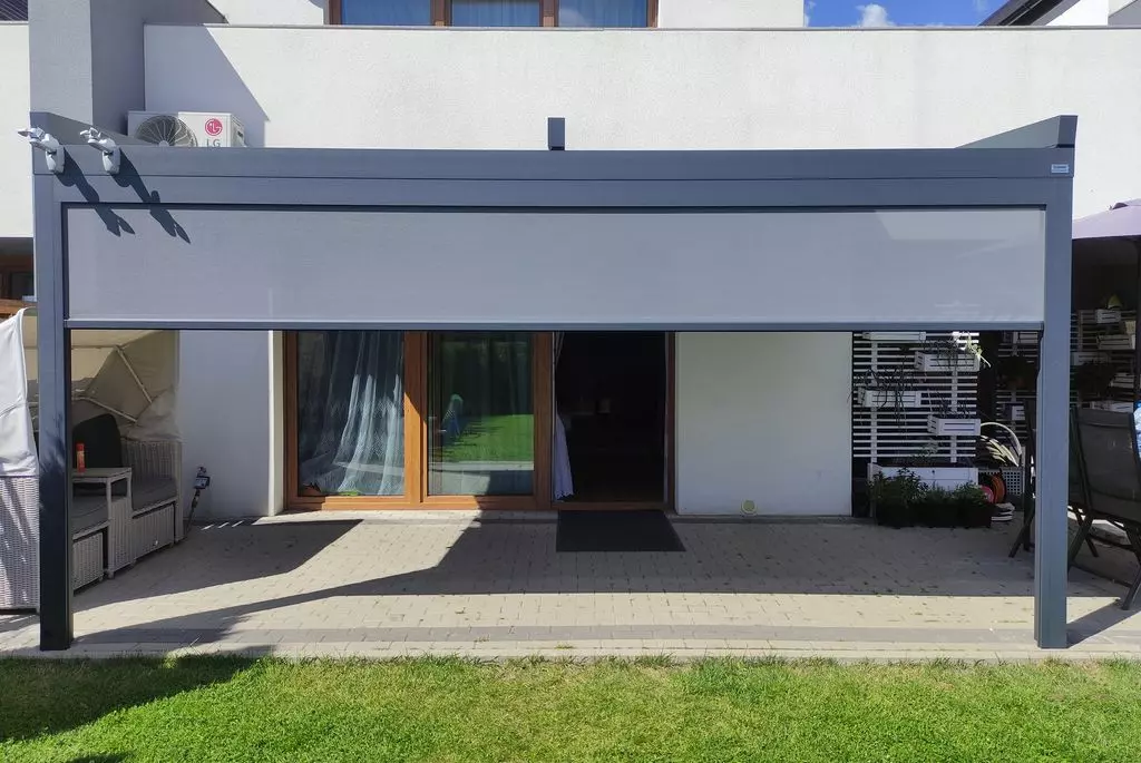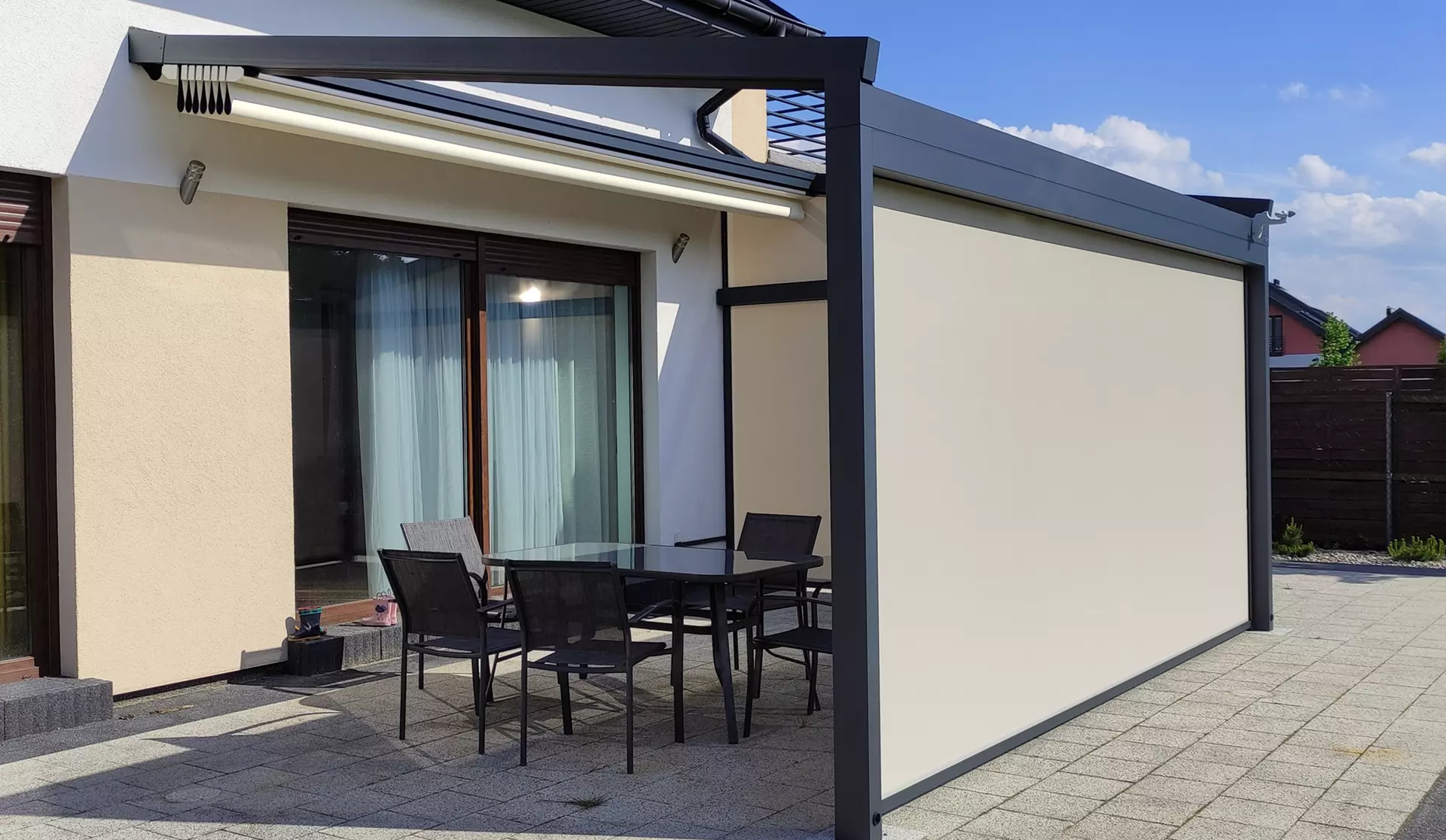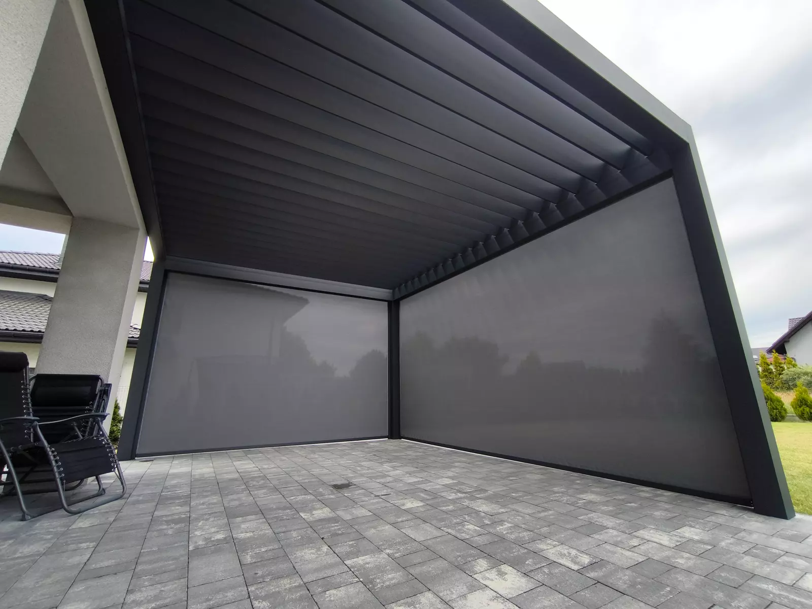 Specjalistyczne tkaniny screen odbijają promienie słoneczne, redukując nagrzewanie się wnętrza pergoli i chroniąc przed szkodliwym promieniowaniem UV, przy jednoczesnym zachowaniu widoczności na zewnątrz.