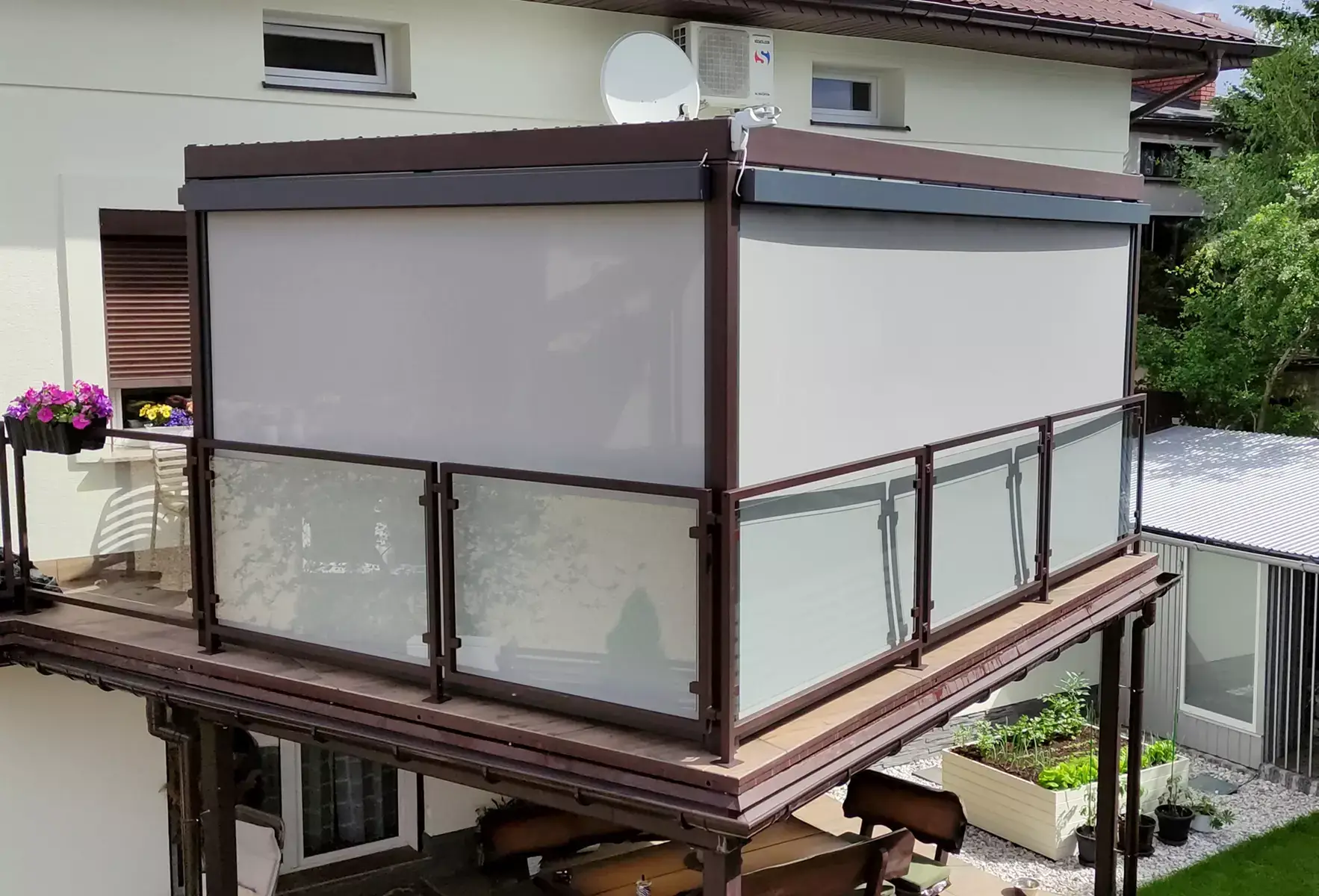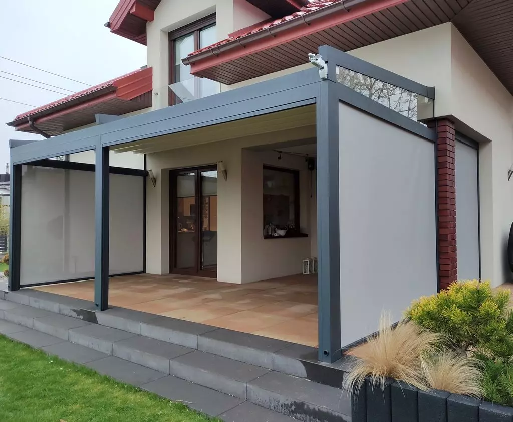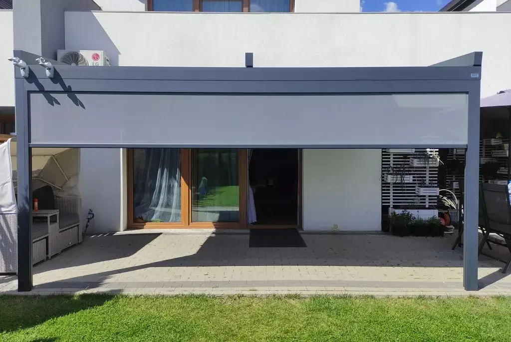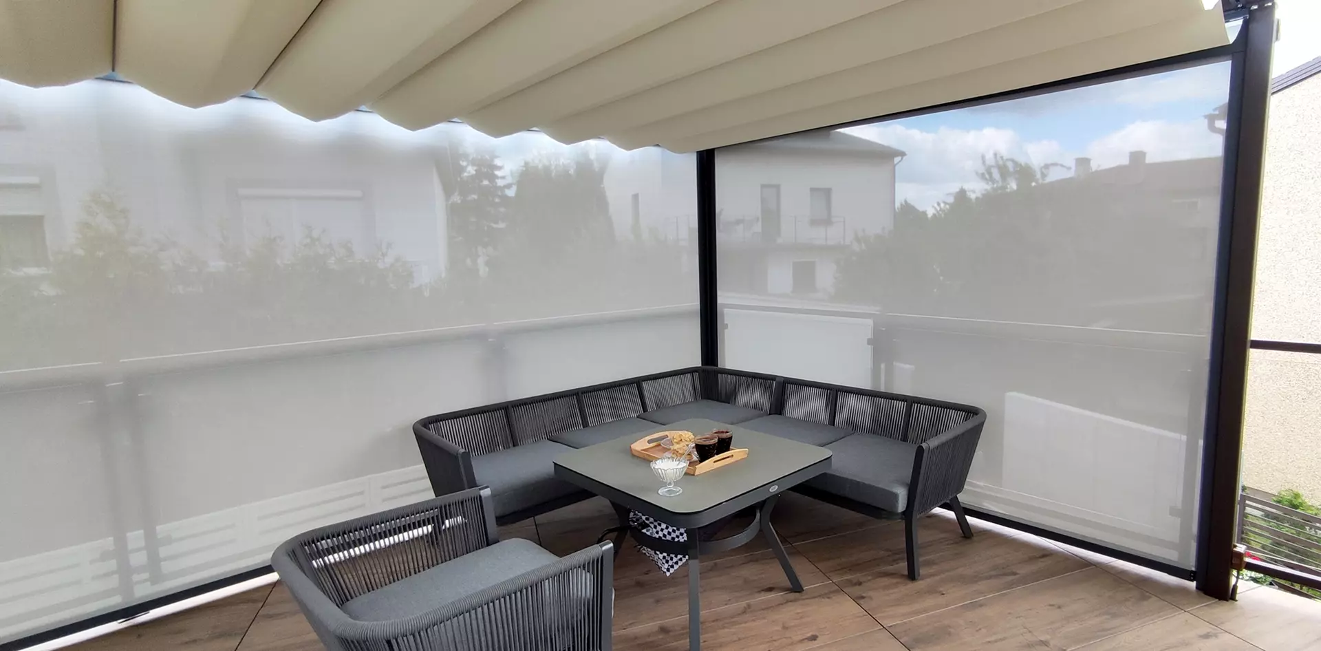 Specjalistyczne tkaniny screen odbijają promienie słoneczne, redukując nagrzewanie się wnętrza pergoli i chroniąc przed szkodliwym promieniowaniem UV, przy jednoczesnym zachowaniu widoczności na zewnątrz.