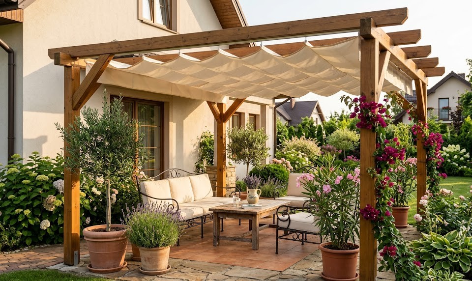 Pergola z zadaszeniem materiałowym w Konstancinie – klasyka w nowoczesnym wydaniu
